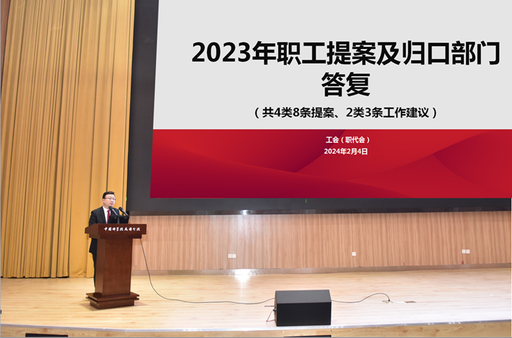 刘刚君代表所务委员会答复职工代表提案,并对工会委员会、职工代表提出要求。要继续发挥民主监督作用,积极为研究所科技创新建言献策。