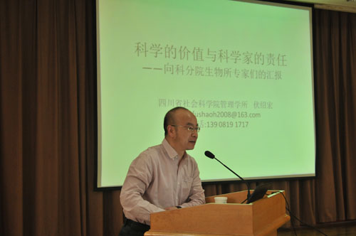 会议邀请四川省社会科学院管理学所伏绍宏研究员为大家作了题为“科学的价值与科学家的责任”的报告。报告从理论的角度详细地阐述了科技异化现象产生的历史根源和社会影响,辩证地分析了科技异化现象与科学家责任之间的因果关系。结合目前国内外科技发展态势,强调了科学家在抑制科技异化还原科技价值中“责任”的重要性,呼吁科学家提高科研活动的质量和效率,杜绝学术的不端行为;将科研活动方向放在有利于社会与自然的可持续发展上,放在对科研活动可能导致的负面影响进行预判并提供解决方案上。