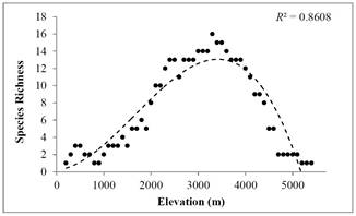 图2 尼泊尔裸子植物物种丰富度与海拔的多项式拟合曲线