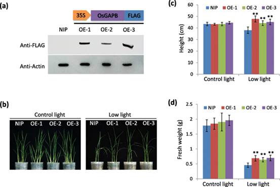 (a)OsGAPB-FLAG蛋白在35S:OsGAPB-FLAG转基因(过表达,OE)株系中表达的免疫印迹分析;35S:OsGAPB-FLAG转基因植株在正常光和低光下的表型(b)、株高(c)和鲜重(d)。