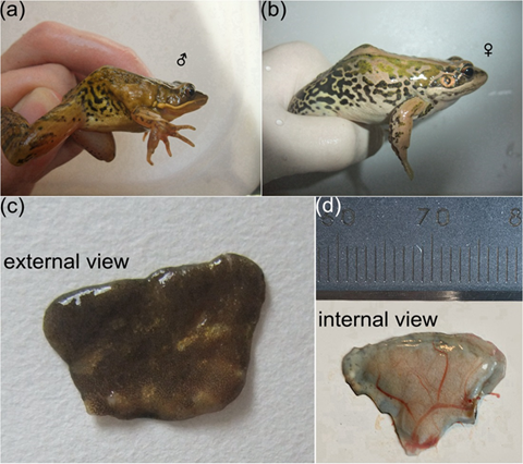 图1. 雌雄滇蛙体侧照片(注意肩腺为雄性特有),及解剖肩腺正反面