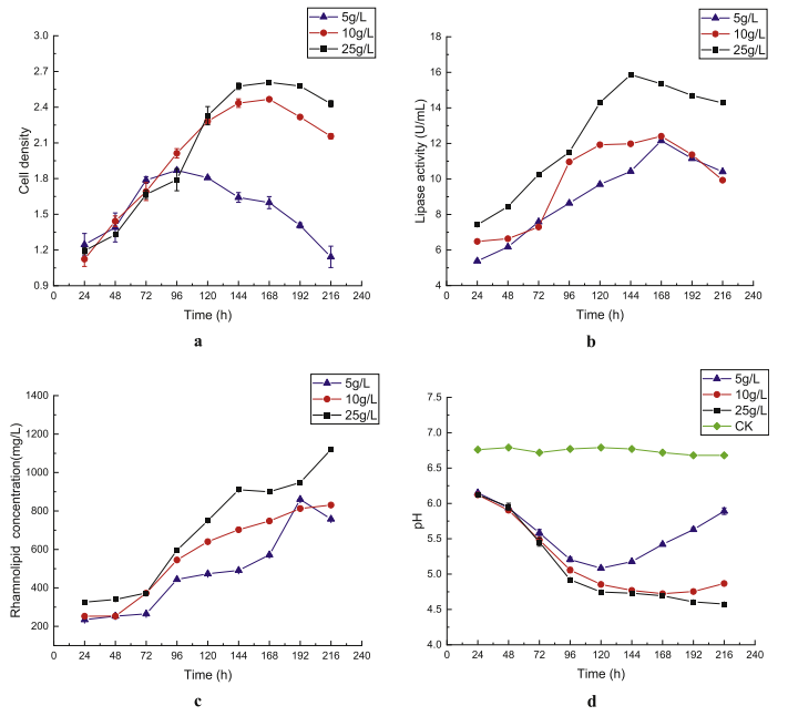1 菌株M4降解不同浓度的WCO时,生物量(a)、脂肪酶活性(b)、鼠李糖脂浓度(c)、pHd)的时间进程曲线