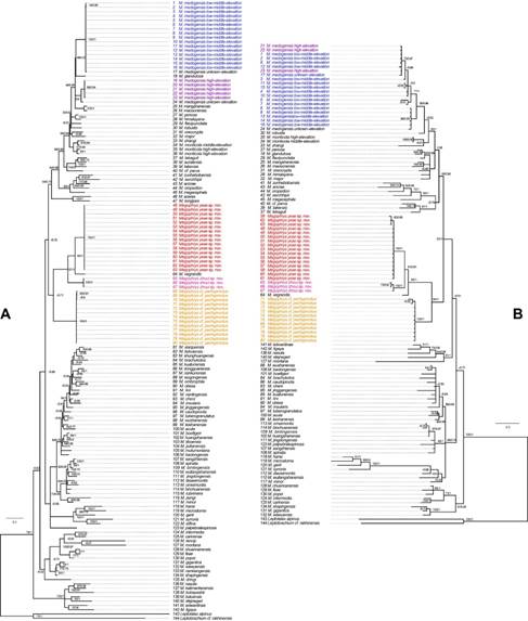 图1 基于线粒体基因(A)及核基因(B)构建的角蟾属系统发育关系。