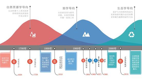 近日,中国科学院成都生物研究所的陈槐研究员及其团队通过对泥炭沼泽研究的专著和文献进行分析,对泥炭沼泽湿地研究的历史沿革及泥炭沼泽湿地若干问题进行了初步阐释。研究发现(图2):从泥炭沼泽研究的历史沿革与态势来看,泥炭沼泽研究大体经历了三个时期,第一个时期到18世纪,是自然资源学导向研究为主的时期,大多数研究着眼于泥炭利用与泥炭地开发;第二时期从19世纪到20世纪,是地学导向为主的时期,大多数研究集中于泥炭沼泽地学方面的研究,沼泽的保护和可持续利用20世纪受到广泛关注;第三个时期从21世纪开始,是生态学导向为主的时期,泥炭沼泽研究已经走上了国际化和可持续发展研究为主的道路,主要侧重于环境及气候变化条件下泥炭地的反馈,泥炭地保护及大自然贡献提升等方面。