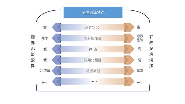 研究还对雨养泥炭地和矿养泥炭地进行了区分,认为雨养泥炭沼泽和矿养泥炭沼泽存在对立统一关系(图3)。雨养泥炭沼泽,降雨补给,营养贫乏,偏酸性;矿养泥炭沼泽,地表水和地下水主要补给,营养丰富,偏弱酸性、中性或弱碱性,但二者在一定条件下亦可相互转化。另外,由于全球沼泽发育的不一致性,作者认为由矿养泥炭沼泽向雨养泥炭沼泽演替模式的传统认识可能存在一定的局限性,需要从全球尺度重新界定泥炭沼泽生态系统的演替模式,气候顶级的演替模式可能并不适用于描述非地带性的泥炭沼泽生态系统。