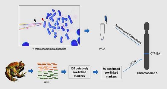 中国科学院成都生物研究所曾晓茂研究员团队罗玮博士等基于GBS基因组测序,筛检四川湍蛙性别关联的SNP位点并以此鉴别性染色体,同时基于显微切割Y染色体并进行Y染色体全基因组测序,将性别SNPY基因组序列比对,最终确认No.5为性染色体对,这是在蛙科中第一次通过基因组水平确认No.5为性染色体对,从而为2n=26的蛙类提供了一个新的性染色体候选对。