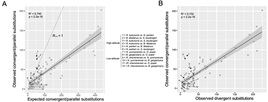 为了研究高海拔适应的平行进化机制,中科院成都生物所生物多样性和生态服务领域团队的吕彬副研究员比较了生活在青藏高原高海拔地区的4种两栖无尾目物种的蛋白编码基因,这些物种属于不同的科,在60-165百万年前已经分化。进化分析结合了8个低海拔近缘物种总计13个物种,检验了物种之间趋同和平行的氨基酸替换水平,拟解答以下问题:1)分子平行进化是在基因组中广泛存在还是仅仅局限于小部分特定的基因和位点?2 什么样的基因参与了平行进化?3 这些趋同/平行基因是否与适应高海拔环境有关?总体而言,高海拔物种受到更强烈的自然选择作用(图1)。我们在高海拔物种间检测到显著超出预期的的趋同和平行氨基酸位点,而类似的情况在低海拔物种中却没有发现(图2)。尽管如此,我们没有检测到全基因组范围的趋同和平行进化,多数替换位点集中在少数几个到几十个基因上,在基因组中并不广泛分布,这些基因的功能多涉及到抗饥寒,耐低氧和免疫,这可能和适应高海拔严酷的生存环境有关,表明平行进化在高海拔适应过程中发挥重要的作用。其中几个基因在3个甚至4个高海拔物种中都发生了趋同/平行进化(图3),并且有3个物种的平行替换发生在同一个氨基酸位置上,表明存在一条共同的高海拔适应进化途径。