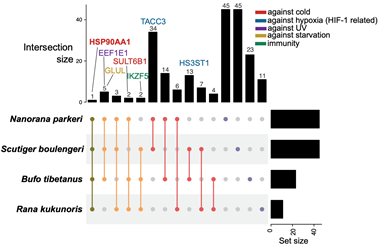 3. 高海拔无尾目物种的趋同/平行进化基因数目及其功能。