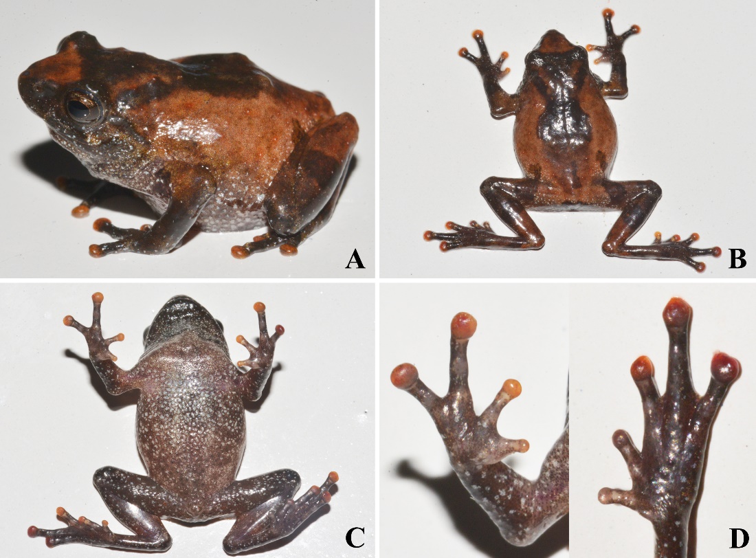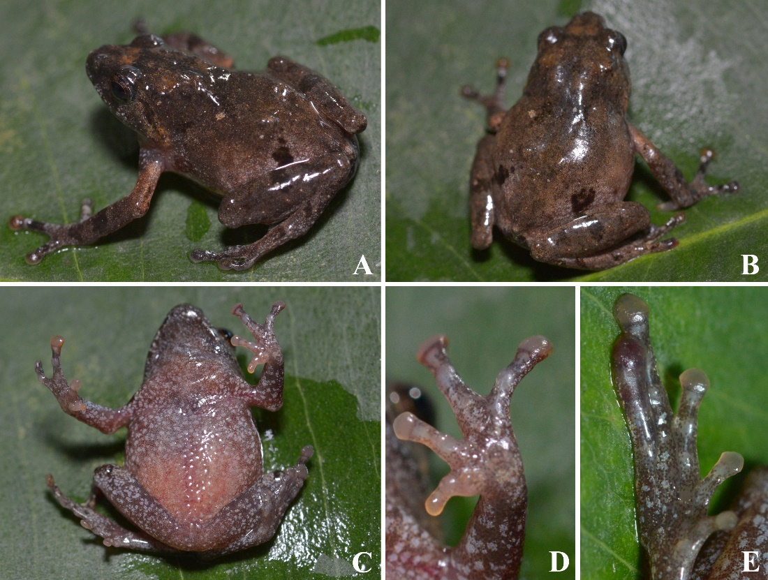 4)将采自云南省红河州绿春县黄连山的标本发表为新种——黄连山灌树蛙R. huanglianshan Jiang, Wang, Ren, and Li, 2020