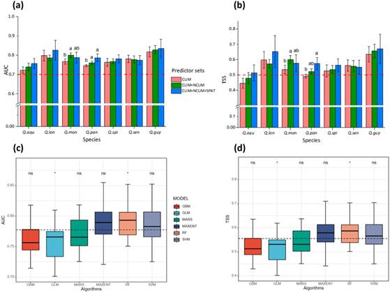 高山栎组植物为研究对象,采用多算法集合模型,包含广义线性(GLM)、通用梯度回归模型(GBM)、多元自适应回归样条(MARS)、最大熵(MAXENT)、随机森林(RF)及支持向量机(SVM),为每种植物构建了3种具有不同预测因子组合的模型:(1)仅气候预测因子(CLIM);(2)同时包括气候和非气候预测因子(CLIM + NCLIM);(3)所有环境预测因子加上