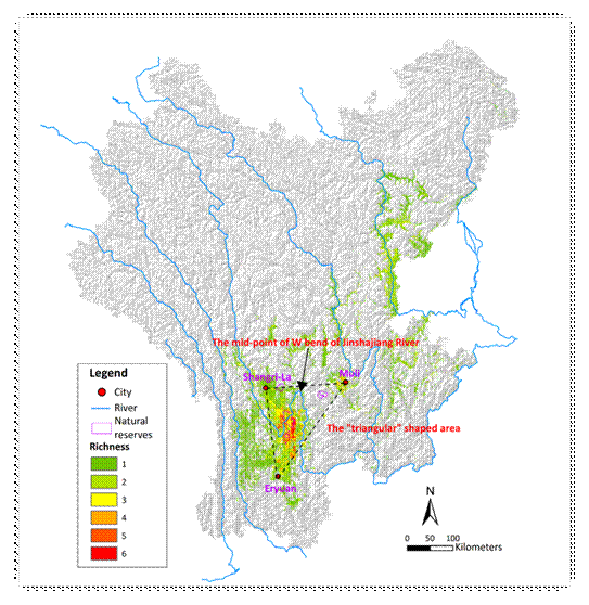 研究表明,高山栎组植物树种的分布同时取决于上述三类变量:气候因素、非气候综合因素及空间限制因素。在集合模型中加入空间特征向量可以降低过度预测的风险,获得更真实的物种分布数据。温度季节性、土地利用、人类影响指数是驱动高山栎组植物物种分布的关键变量,模型预测变异性分解则表明分布最广的物种(川滇高山栎)和分布面积最小的物种(长穗高山栎和帽斗栎)受空间限制因子的影响最大。研究还模拟出一个由香格里拉、木里和洱源组成的三角形保护核心区,该核心区位于四川和云南交界处,是高山栎组植物在横断山地区的丰富度中心。然而,目前的保护区仅仅覆盖了很小面积的区域,因此有必要在该区域加强对高山栎组植物的保护。该研究基于多变量集和多算法更加准确地预测高山栎组植物的分布,明确其分布范围、丰富度中心和主要影响因素,为硬叶栎树种的资源利用与保护提供重要的参考依据,也为这一区域国土空间生态修复在修复空间识别、修复措施选择等方面提供了依据。