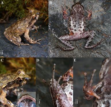 A 背侧面,B 腹面,C 头侧,D 足腹面,E 手腹面,F 上颌内侧,示无犁骨齿,仅具犁骨棱