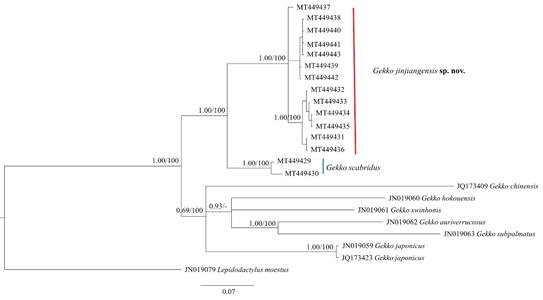 利用线粒体ND2基因片段进行系统发育分析显示:金江壁虎为一个独立的进化分支,与粗疣壁虎Gekko scabridus互为姐妹群。金江壁虎与粗疣壁虎的遗传分化显著,ND2遗传距离达9.9%–12.2%。