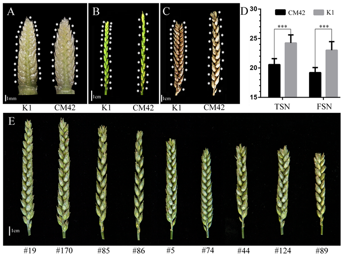 小麦(Triticum aestivum L.)作为最重要的粮食作物之一,为全世界人口提供了约20%的能量摄入和重要的蛋白质来源。我国是小麦生产和消费第一大国,培育高产小麦品种,不断提高小麦产量是保障我国粮食安全的重要措施之一。穗粒数是小麦产量三要素之一,与穗形态发育密切相关。小麦穗(spike)是由附着在穗轴两侧、交替互生的小穗(spikelet)构成。每个小穗包含数目不等的小花(floret),每个可育小花能形成一个籽粒。因此,每穗小穗数和可育小花数决定了穗粒数,进而显著影响籽粒产量。揭示小麦小穗数形成的遗传基础,对于培育高产小麦品种具有重要理论及实践意义。