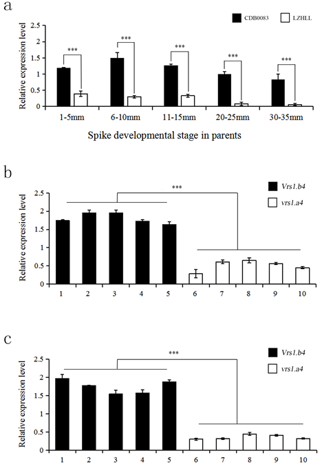 图二 Vrs1在群体后代以及不同vrs1.b4\vrs1.a4品种(系)幼穗中的表达分析。