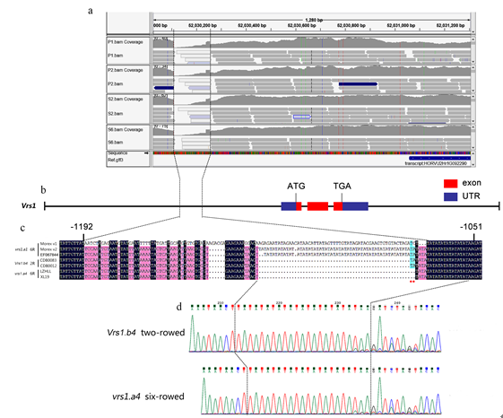 大麦花序是由三联小穗构成。三联小穗中侧小穗结实与否产生了二棱和六棱大麦的分化。棱数直接影响籽粒产量,是大麦重要的驯化性状。前人研究表明,大麦棱型主要受Vrs1six-rowed spike1)基因决定,已鉴定出7种主要的等位基因:二棱大麦中的Vrs1.b2、Vrs1.b3Vrs1.b4和六棱大麦中的vrs1.a1、vrs1a2、vrs1.a3vrs1.a4。野生型Vrs1.b对侧小穗发育具有抑制作用,而突变型vrs1.a多为功能缺失型突变,丧失了对侧小穗发育的抑制作用。有趣的是,六棱大麦中的vrs1.a4与二棱大麦中的Vrs1.b4拥有相同的编码序列。携带vrs1.a4的大麦产生六棱性状的决定因素仍不清楚。