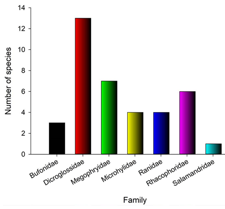 中国科学院成都生物研究所两栖动物进化与保护团队在江建平研究员的带领下,从2010年开始在尼泊尔境内进行了多次野外考察,足迹遍布该国东部、中部和西部(图1),通过长达十年的工作,已经在尼泊尔境内发现两栖动物38种,隶属于2目7科(图2)。其中已经发表新种4个(有尾类疣螈属新种Tylototriton himalayanus、无尾类姬蛙属新种Microhyla taraiensis、无尾类齿突蟾属新种Scutiger ghunsa、无尾类湍蛙属新种Amolops mahabharatensis),另有部分潜在新种有待进一步分析。此外还有尼泊尔两栖动物3个新纪录,并订正了1种即Sphaerotheca paschima的分类地位。