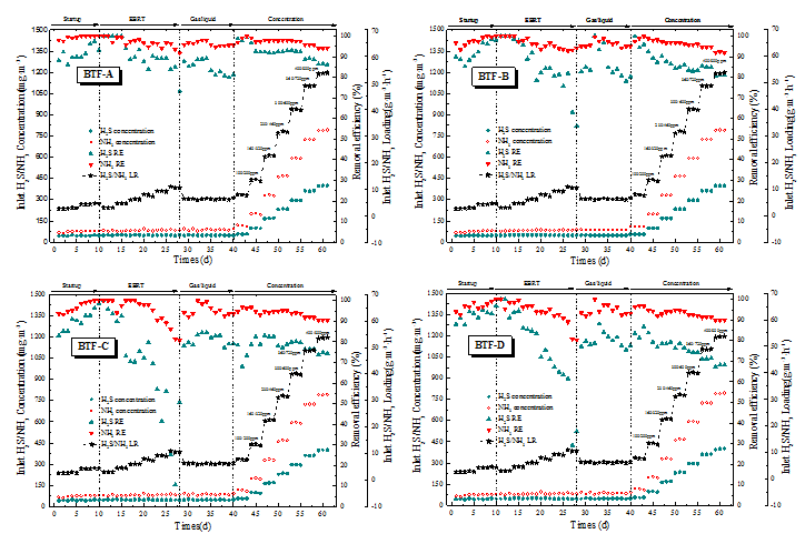 中国科学院成都生物研究所污染生物治理项目组研究生宦臣臣在吕青阳博士、闫志英研究员的指导下,以混合营养条件为基础,采用松树皮、煤渣、秸秆和移动床生物膜反应器(MBBR)作为填料,同时处理高浓度的H2S和NH3混合废气。结果表明,在H2S和NH3的进气负荷为53.59 g/m3·h,空床停留时间(EBRT)为40.5 s的条件下,以松树皮为填料的BTF-A去除率最高,分别为86.31%和94.06%。通过动力学曲线拟合得到理论最大负荷为90.09 g H2S m-1·h-1和172.41g NH3 m-3·h-1。同时,当NH3的进气浓度为720ppm时,BTF循环液中NO3-平均浓度仅为127.58 mg/L,二次污染物控制效果较好。对反应器中微生物分析发现,Dokdonella、Micropruina、Candidatus_Alysiosphaera、Nakamurella和Thiobacillus在属水平上具有较高的丰度,在4个BTF反应器中的整体比例分别为62.87%、46.32%、47.98%和57.35%。值得注意的是,在4个反应器中,具有HN-AD功能的菌株Comamonas和Trichococcus的占比分别为3.66%、1.45%、5.43%和3.23%。研究成果为生物滴滤反应器(BTF)在混合营养条件下有效去除恶臭气体提供了理论和实践依据。