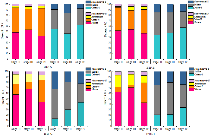 图3 生物滴滤反应器在不同运行阶段脱硫脱氮产物组成