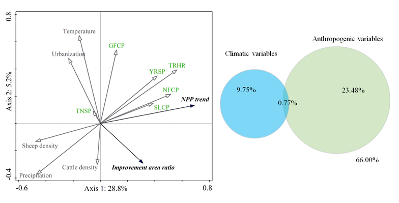 为解决以上问题,中国科学院成都生物研究所生物多样性与生态系统服务领域地表过程与生态系统管理项目组熊勤犁、吉首大学肖洋副教授中山大学梁平汉教授等以青藏高原草地为研究对象,系统的揭示1980–2015年青藏高原草地净初级生产力(NPP)的空间分布和时序变化,使用趋势分析和冗余分析来确定驱动指标(气候变化和人类扰动)对NPP变化的贡献。近35年来,青藏高原草地生产力呈现明显改善趋势(增加量1.08 g C/m2/年)。总草地面积的82.79%呈改善趋势,其中大部分分布在高原中部地区,而高原的西北部地区则出现了退化的趋势。植被生产力空间格局和分布变化复杂的主要原因是气温和降水变化不同步。这种空间的不同步所带来的差异直接导致温度和水供给量(包含降水和冰川融水)不能成为该地区NPP变化趋势的良好指标。此外,虽然降雨量和温度的变化解释了草地生产力变化的9.75%,但人为干预的影响更大(23.48%)。多数生态恢复工程对草原恢复产生了显著的积极作用,防止或逆转了高原草原退化。根据冗余分析,大型生态恢复工程的积极贡献(减少人类活动负面影响)是整个研究区域草地生产力变化最重要的指示指标,其次是温度(有利于植被生长和加速冰川融化)。 不同于青藏高原气温和湿度区域不协同差异性,生态恢复工程均呈现出“草地生产力增加的趋势”,可作为植被生产力变化的标志物。