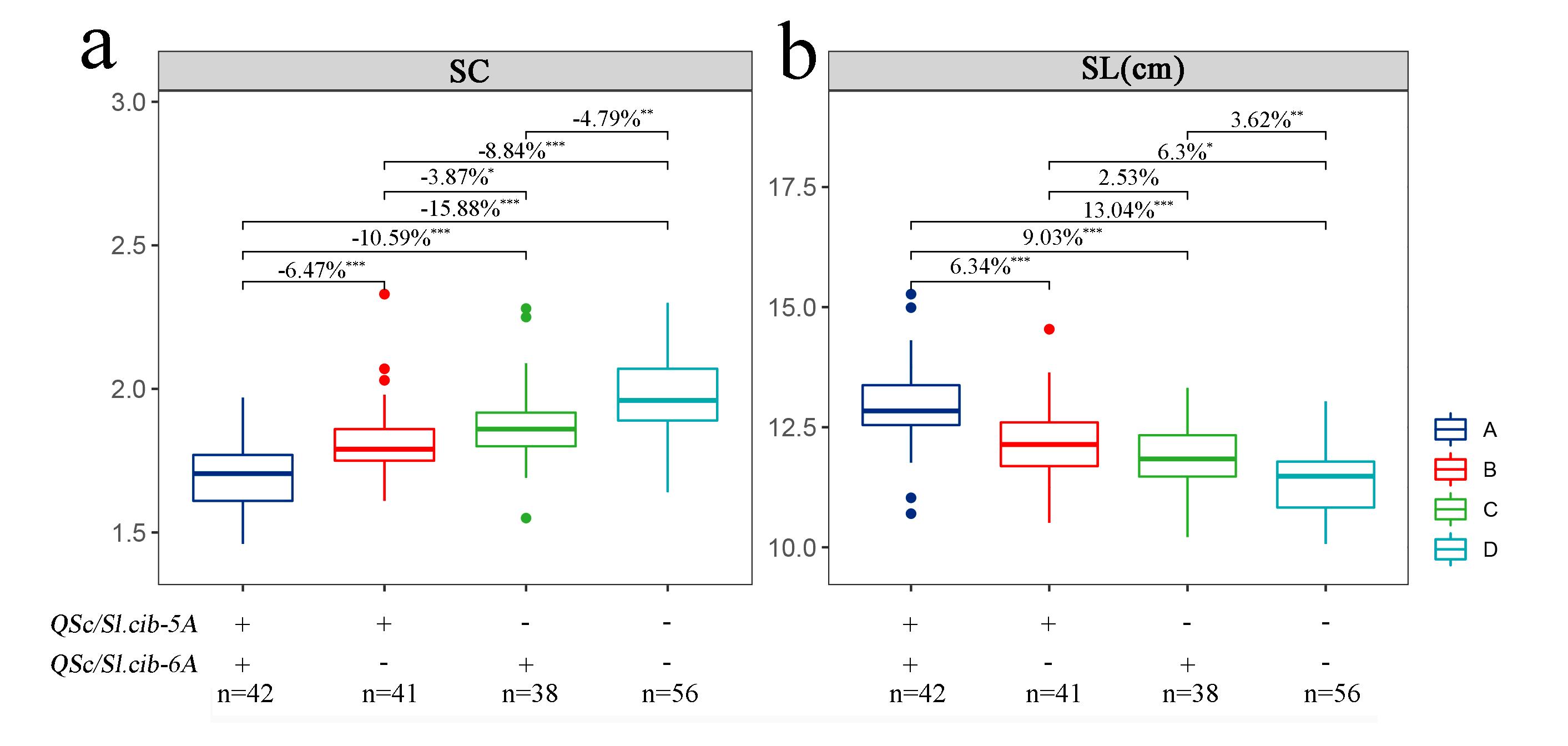 图6、不同遗传背景验证QSc/Sl.cib-5A和QSc/Sl.cib-6A