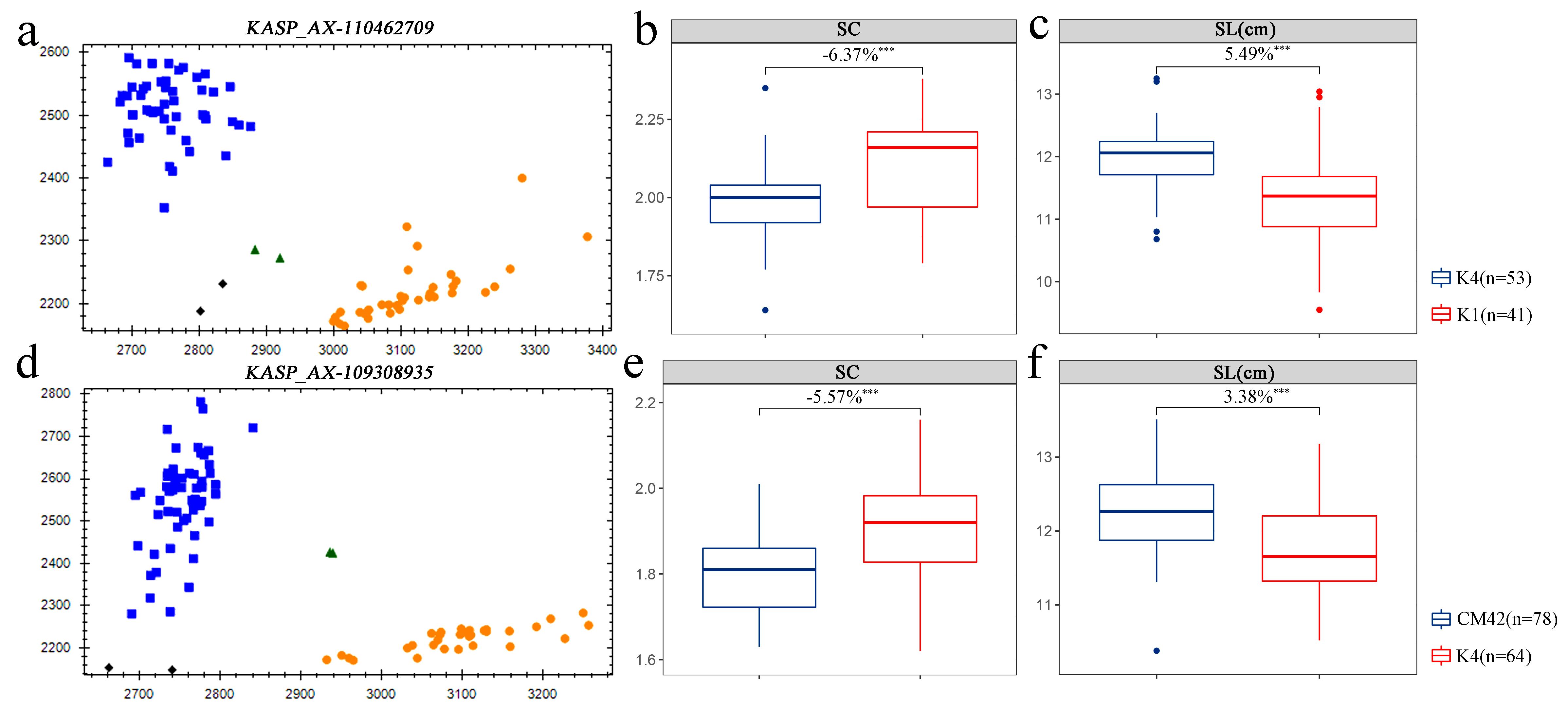 为了解析小麦穗长和穗密度的遗传机制,中科院成都生物研究所龙海研究团队利用川麦42×科成麦1号的DH群体(CK1)和川麦42×川农16的RIL群体(CC)在多个环境中进行QTL定位。其中川麦42是由四川省农业科学院杨武云研究员利用人工合成小麦的培育优良小麦品种,具有产量高,抗条锈病能力强等优点。相比于川麦42,科成麦1号和川农16穗长较短,穗密度较高。基于3年2点5个环境的表型数据,共鉴定到34个穗长和穗密度的QTL,其中6个主效QTL在超过4个环境中被稳定检测到,解释了7.13-33.6%的表型变异。这些主效QTL位于染色体5A和6A上的两个基因组区域,分别被命名为QSc/Sl.cib-5A和QSc/Sl.cib-6A。两个主效QTL对穗长和穗密度的影响存在显著的加性效应。此外通过开发与之紧密连锁的KASP分子标记,在不同的遗传背景中进一步验证了QSc/Sl.cib-5A和QSc/Sl.cib-6A。比较分析结果表明,QSc/Sl.cib-5A不是春化基因Vrn-A1和基因Q;QSc/Sl.cib-6A可能是新的穗长和穗密度位点。效应分析结果显示,QSc/Sl.cib-5A和QSc/Sl.cib-6A对其他产量相关性状包括株高、千粒重和粒长均具有显著的影响。此外,基于基因表达模式、基因注释、直系同源分析和序列差异分析,TraesCS5A01G301400和TraesCS6A01G090300被认为是QSc/Sl.cib-5A和QSc/Sl.cib-6A可能的候选基因。本研究鉴定到的主效QTL和开发的KASP分子标记为后续穗长和穗密度相关基因的精细定位和克隆奠定了理论基础,也有助于小麦的分子标记辅助育种。