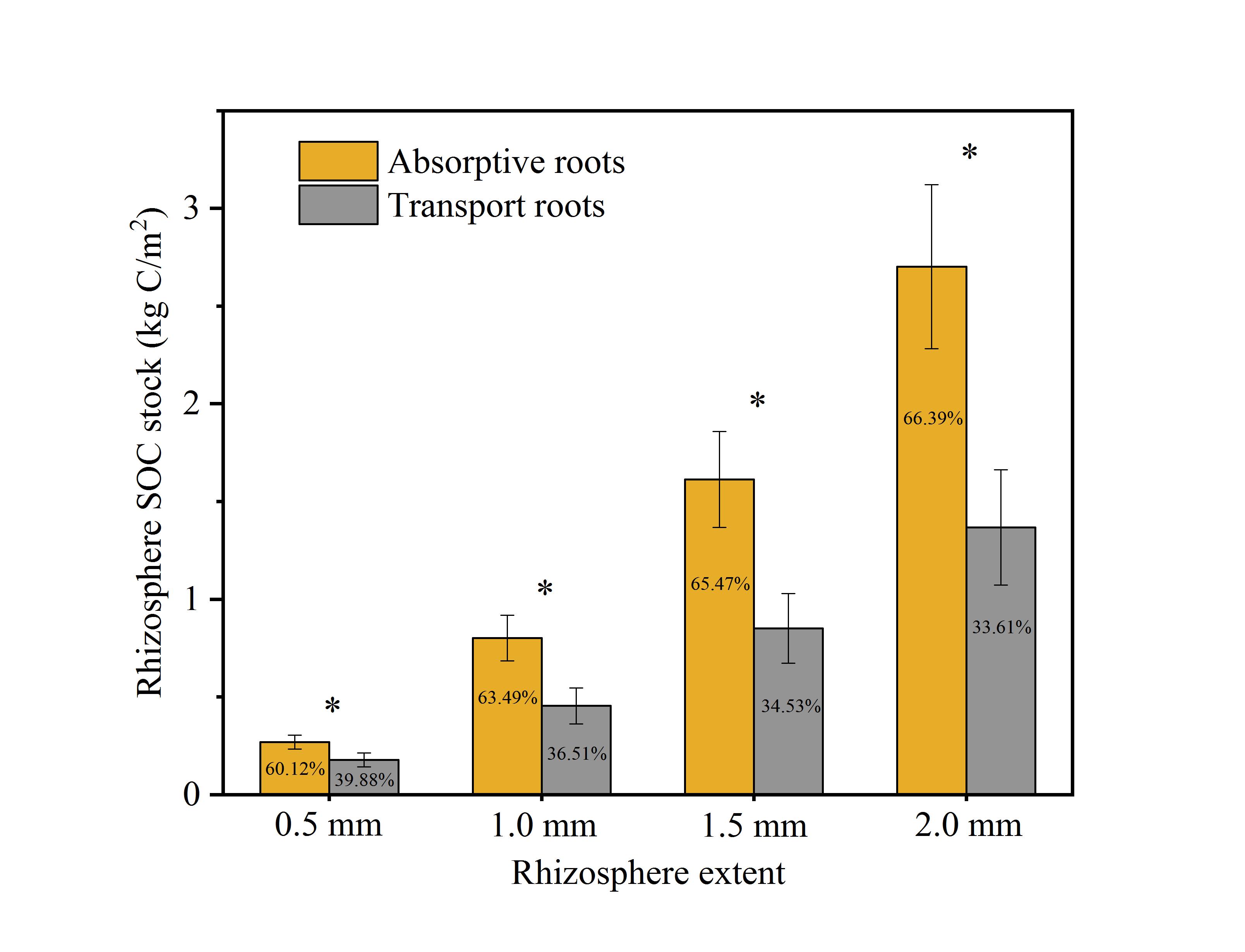 基于此,中国科学院成都生物研究所森林生态过程与调控项目组尹华军研究团队以西南亚高山典型的人工林云杉(Picea asperata)为试验对象,通过分离吸收根(1-3级细根)和运输根(4-5级细根)两个根系功能模块,结合根际空间数值模型,量化了吸收根和运输根根际SOC储量差异及其对根际总土壤碳储量的相对贡献大小。研究结果表明:I)吸收根根际SOC浓度(47.65 mg/g soil)显著高于运输根根际(41.2 mg/g soil),且吸收根根际具有更强的SOC的化学保护作用(表现为惰性碳组分比例和金属有机复合体含量更高)。II)在林分尺度上,吸收根根际SOC库(0.27~2.7 kg C/m2)大约是运输根根际(0.18~1.36 kg C/m2)的2倍(图1)。III)在根际1mm范围内,吸收根根际SOC储量对根际总SOC积累的贡献(63.49%)显著高于运输根根际SOC储量(36.51%)(图2)。这些结果表明,亚高山人工针叶林吸收根介导的根际土壤C储存在根际土壤碳储量中发挥主导性作用。上述结果为理解森林生态系统根系在土壤碳动态中的重要作用提供了新的视角。