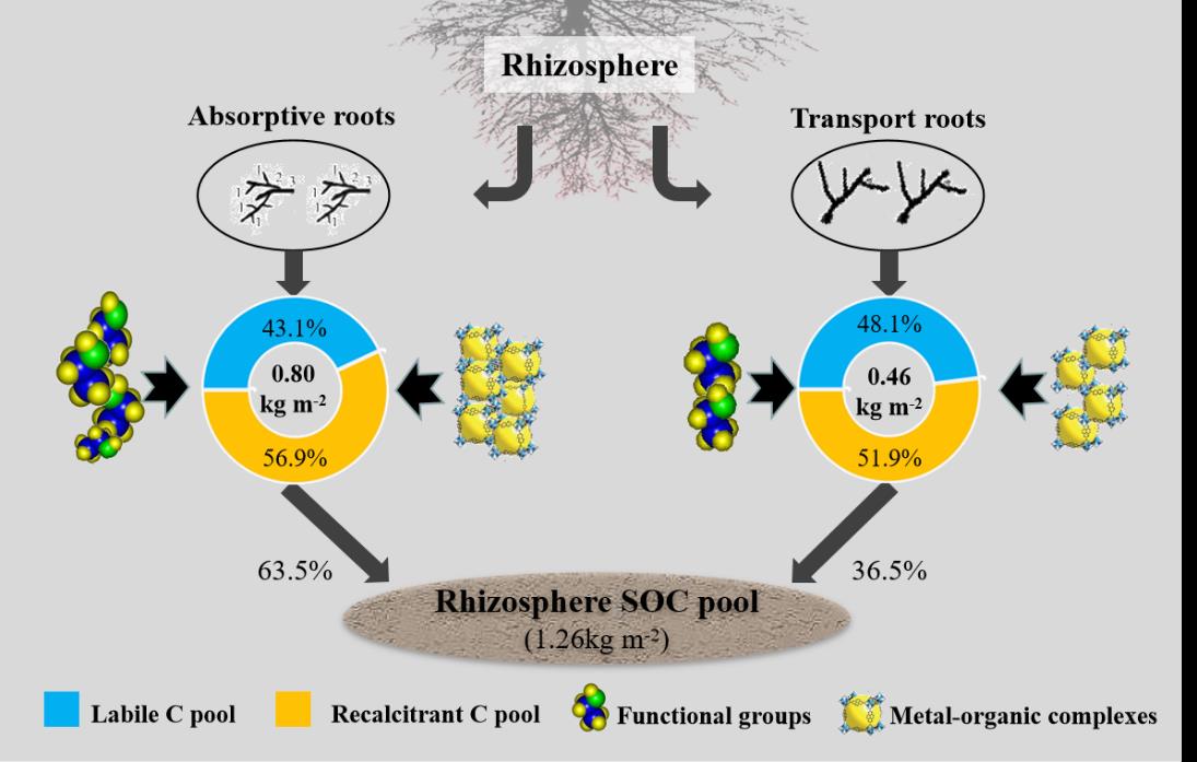 土壤有机碳(SOC)的形成、稳定和周转等动态变化过程已经成为当前生态学和土壤学领域亟需解决的核心科学问题之一。根系在调控土壤碳动态中的重要作用已经得到广泛认可,并在很大程度上取决于根系功能属性特征。具体而言,作为一个高度复杂且功能异质的分支系统,根系生理代谢活性在吸收根和运输根之间具有明显差异,从而导致根际SOC固存和稳定性在不同根系功能模块间呈现出高度的异质性特征。但是,现有的根际模型和实验研究大多将根际区简单视为一个均一体,很少考虑根系生命活动诱导的根际土壤碳动态在根系功能属性分化上的变异,极大地限制了在细微尺度上对森林生态系统土壤碳固存和稳定性机制的全面认识与理解,加剧了对根际土壤碳储存和持久性的评估和预测的复杂性。