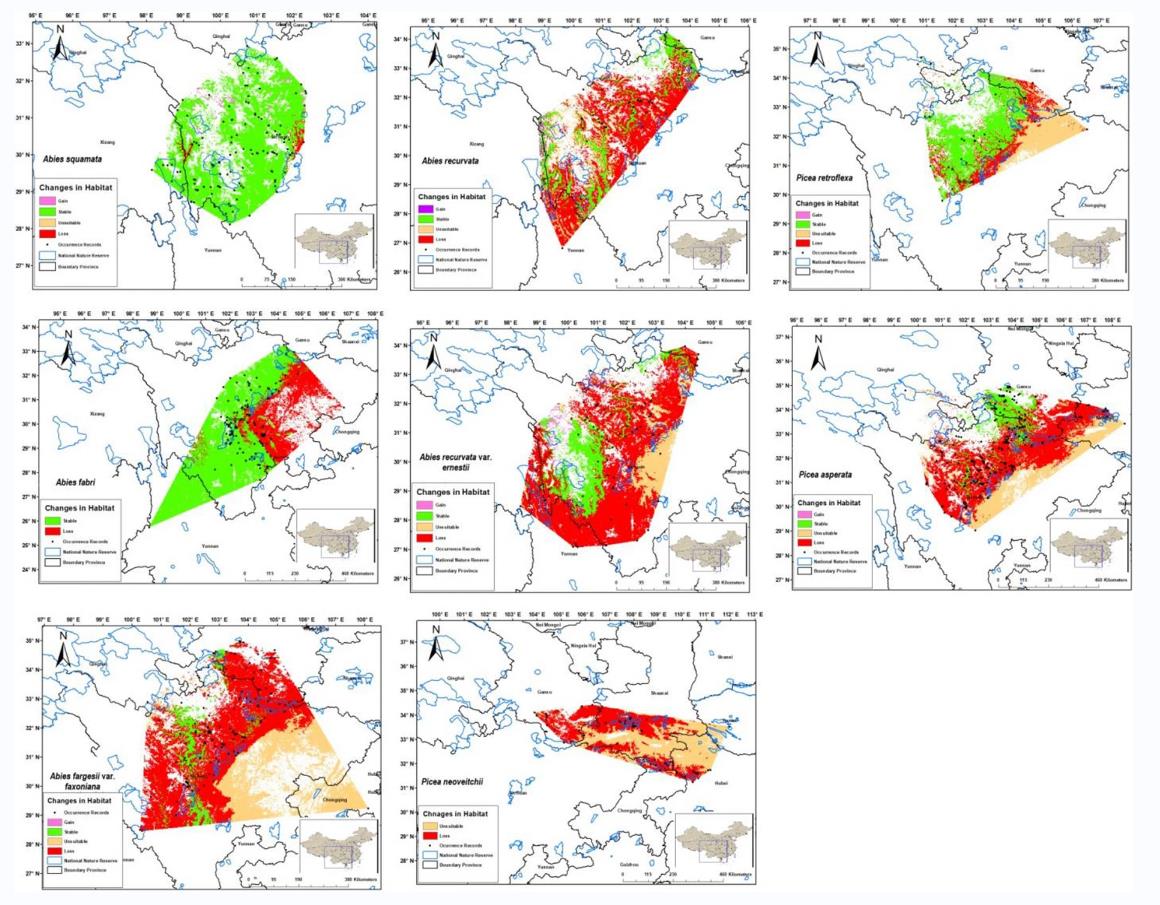 中国科学院成都生物研究所生态过程与生物多样性保护课题组博士研究生Mohammed A. Dakhil在博士生导师潘开文研究员的指导下,以冷杉属的冷杉(Abies fabri)、岷江冷杉(Abies fargesii var. faxoniana)、紫果冷杉(Abies recurvata)、黄果冷杉(Abies recurvata var. ernestii)、鳞皮冷杉(Abies squamata)和云杉属的云杉(Picea asperata)、大果青扦(Picea neoveitchii)、鳞皮云杉(Picea retroflexa)为研究对象,利用广义线性模型、增强回归树和随机森林三种模型,基于国际自然保护联盟红色清单标准,评估未来气候排放情景(RCP 4.5和RCP 8.5)下中国西南地区上述8个针叶树种AOO范围的变化。研究表明:在两种排放情景和两种扩散(限制和无限制)假设下,栖息地适宜性和AOO的潜在变化相似。表现为冷杉、黄果冷杉、岷江冷杉和大果青扦在不同气候和扩散情景下预测的AOO中损失百分比最高(≥ 90%),且除鳞皮云杉和鳞皮冷杉外所有研究物种的保护状态都将转移到更高的灭绝风险。这意味着:冷杉、岷江冷杉、黄果冷杉和大果青扦应当在未来的保护工作中得到优先保护,建议将四川省境内的横断山中段、邛崃山、大雪山、岷山、大巴山以及与四川相邻的甘肃南部区域纳入当前或未来涉及原地或迁地保护的行动方案。上述结果为评估未来气候与环境变化对物种分布及栖息地的可用性综合建模方面提供了一个范例。