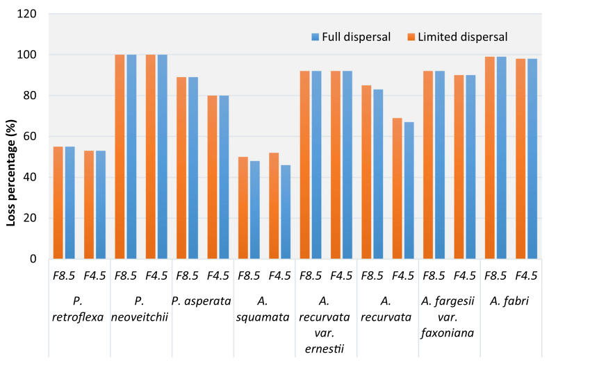 图2 基于两种气候情景(RCP 4.5和RCP 8.5)和两种扩散假设(完全和有限)的占用面积损失百分比(AOO)