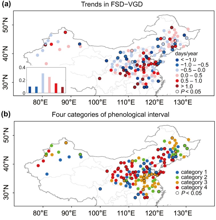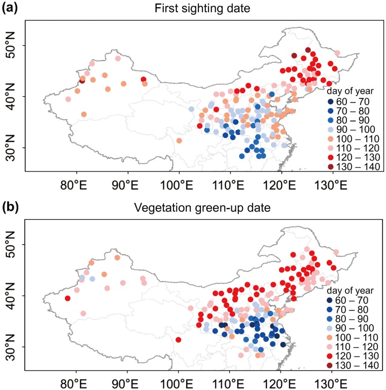 图2. 家燕始见日(a)和植被返青始期(b)的空间格局(圆点代表各站点1982–2010年间的均值)
