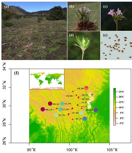图1.芒苞草的形态学特征和种群样本的地理分布。(a)生境 (b)习性 (c)花 (d)果实 (e)种子 (f)14个种群的取样地点。