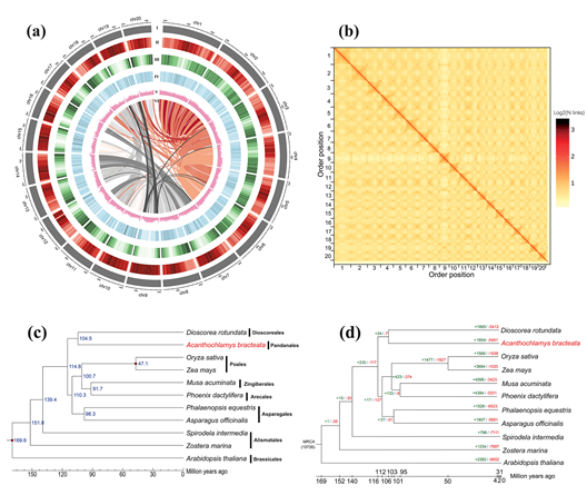 图2.(a)芒苞草染色体水平的基因组图 (b)Hi-C热图 (c)11个物种的系统发育树 (d)11个物种基因家族收缩和扩张分析。