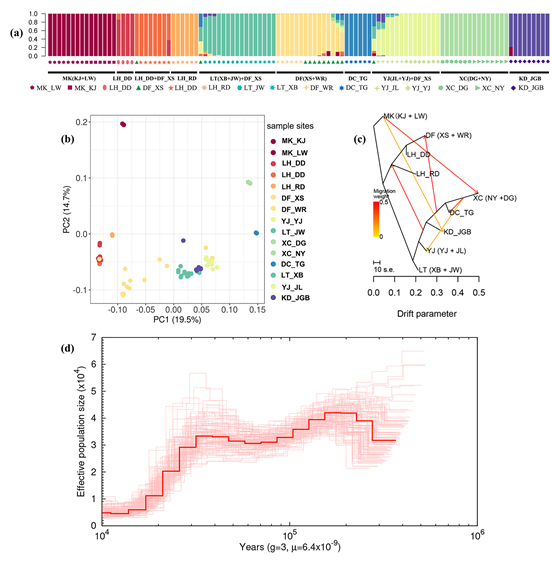 图3.芒苞草种群遗传结构和种群历史动态。(a)110个芒苞草个体的种群结构 (b)主成分分析(PCA) (c)基因流 (d)种群历史动态。
