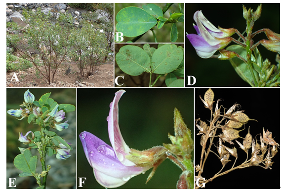 1 禄劝杭子梢Campylotropis luquanensis。A生境,B叶正面,C叶背面,D总状花序(花序轴、总花梗与花梗),E枝和花序,F放大的花(旗瓣、翼瓣、龙骨瓣与花萼),G果序与荚果