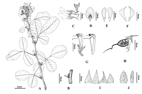 2 禄劝杭子梢Campylotropis luquanensisA枝,B四棱形小枝,C总状花序与花,D旗瓣,E翼瓣,F龙骨瓣,G雄蕊、雌蕊与花萼,H幼果,I托叶,J苞片与小苞片