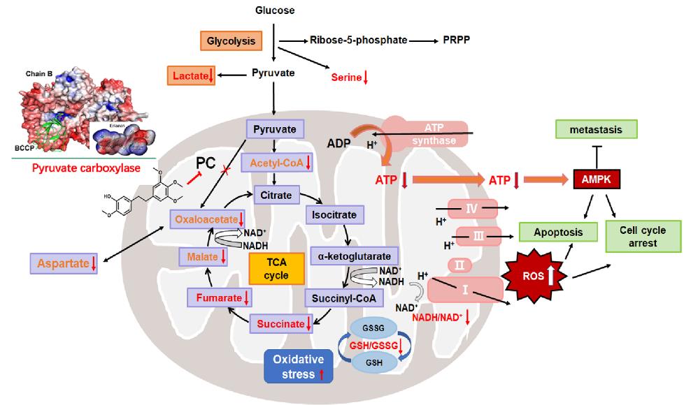 代谢异常是肿瘤的主要特征之一。肿瘤细胞可通过Warburg效应,在有氧环境下加速糖酵解来提供增殖和迁移的能量。然而,Warburg效应产生ATP的效率相对较低,仅靠增强糖酵解不足以为肿瘤生长和转移提供足够的能量和所有必需的代谢中间体。因此,癌细胞进一步利用草酰乙酸作为重要的碳源,补充三羧酸循环(TCA)中间体的生物合成前体,从而促进细胞间回补,满足合成代谢需求。丙酮酸羧化酶(Pyruvate Carboxylase,PC)是催化丙酮酸羧化生成草酰乙酸的关键线粒体酶,抑制PC酶活性能够有效阻断肿瘤细胞能量回补,从而导致肿瘤细胞因能量匮乏无法增殖、迁移,是一个潜在的肿瘤治疗新靶点,但是目前尚缺乏有效的PC酶抑制剂。