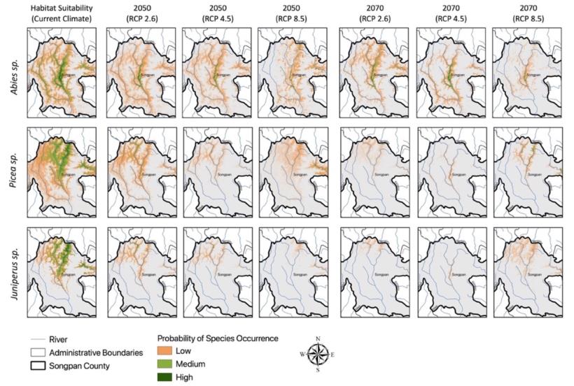 上述研究以“Potential distribution of Abies, Picea, and Juniperus species in the sub-alpine forest of Minjiang headwater region under current and future climate scenarios and its implications on ecosystem services supply”为题发表于Ecological IndicatorsIF=4.958);以“Assessing the impact of climate change on potential distribution of Meconopsis punicea and its influence on ecosystem services supply in thesoutheasternmargin of Qinghai-Tibet Plateau”为题发表于Frontiers in Plant Science(IF=5.753)。本研究得到中国科技部中国科学技术交流中心国际杰青计划科学家项目(Indian-18-008),国家自然科学基金(31971436; 41661144045)和中国科学院西北生态环境资源研究院冰冻圈科学国家重点实验室项目(SKLCS-OP-2018-07)支持。