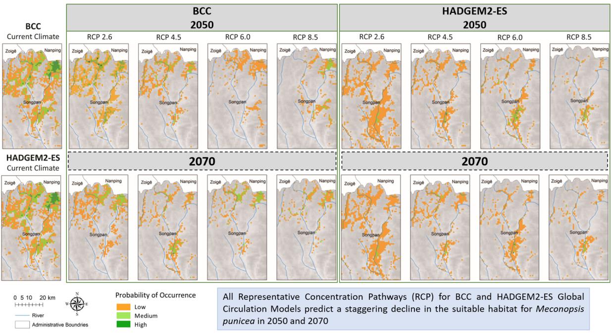 图2 不同气候变化情景下红花绿绒蒿(M. punicea)的分布变化