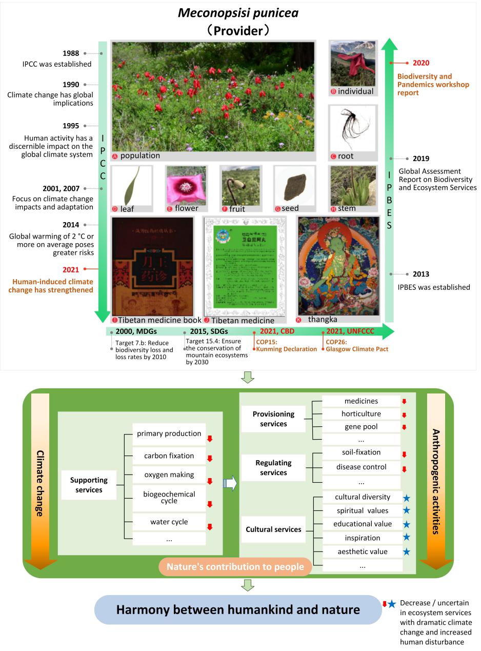 在前期对全球绿绒蒿属植物研究势态文献计量分析综述的基础上(石凝等. 草业科学, 2020),进一步对于国家野生二级保护植物、典型灌丛草甸物种红花绿绒蒿进行了模型模拟。结果表明土壤类型、最湿月份的降水、降水季节性和年温差是决定其分布的关键变量。在当前气候情景下,适宜生境相对分散,且高适宜生境主要集中在研究区北部。相较于当前气候情景,未来气候情景下的适宜生境范围出现了急剧下降,且高适宜性的地区受到的影响最为严重,同时其平均分布海拔会上移。在栖息地面临丧失,种群缩小的情况下,红花绿绒蒿的支持、供给和调节服务能力会下降。由于文化服务是基于个体对自然的感受,很大程度上是主观的。尽管气候变化造成的文化影响很难去界定,但还是应当注意引导其朝着改善和可持续的方向发展。