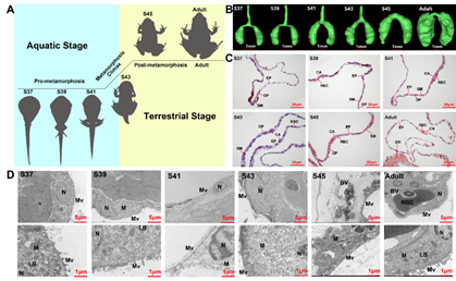 这项研究工作以“From Water to Land: The Structural Construction and Molecular Switches in Lungs during Metamorphosis of Microhyla fissipes”为题发表于国际期刊“Biology”。该研究揭示了变态发育过程中两栖动物肺结构和功能建成的关键步骤,为脊椎动物空气呼吸方式的演化提供了线索。中国科学院成都生物研究所博士研究生常利明为文章的第一作者,中国科学院成都生物研究所江建平研究员和朱未助理研究员为共同通讯作者。该研究得到第二次青藏高原科学考察项目(2019QZKK05010503)、中国科学院重点部署项目(KJZG-EW-L13)、国家自然科学基金(31900327, 31471964)、四川省科技基础条件平台建设等项目的资助(2019JDPT0020)。
