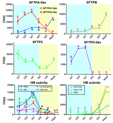 从关键功能分子转录模式来看,在变态高峰期,成体型血红蛋白逐渐代替了幼体型血红蛋白,而且不同类型肺表面活性蛋白的转录模式也在这一时期发生转变(图3)。这些功能分子表达模式的转变可能是肺呼吸功能趋于成熟的重要表征和物质基础。