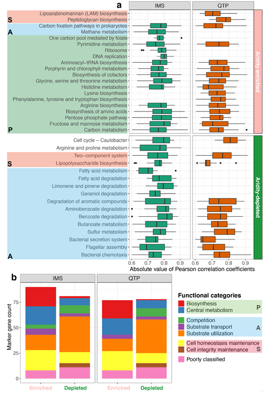 1 随干旱增加而富集和减弱的KEGG代谢途径(FDR < 0.05)(a)及marker基因(AI| ≥ 0.85, FDR < 0.001)(b)。图(a)中的柱状图代表KO相对丰度与干旱度指数的Pearson相关系数的绝对值。IMS: 内蒙古草原;QTP: 青藏高原;P: 细胞和高生长潜力维持策略;A: 资源获取策略; S: 胁迫耐受策略。对于表征Y策略的代谢途径和指示基因尚不清楚。