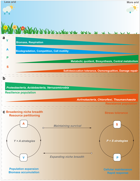 2草原生态系统中土壤微生物生活史策略的变异。图(a)为微生物生活史策略随干旱增加的变化模式及表征该生活史策略的典型特征;图(b)为土壤微生物群落随干旱增加的变化模式;图(c)为干旱梯度上土壤微生物群落的生态适应概念图。Y:生长产量策略;P: 细胞和高生长潜力维持策略; A: 资源获取策略; S: 胁迫耐受策略。