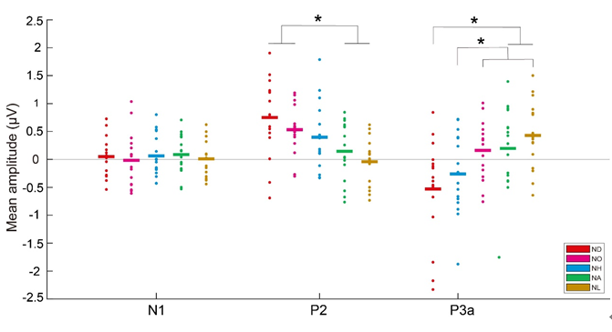 图2 不同广告鸣叫诱发的事件相关电位成分的变化模式