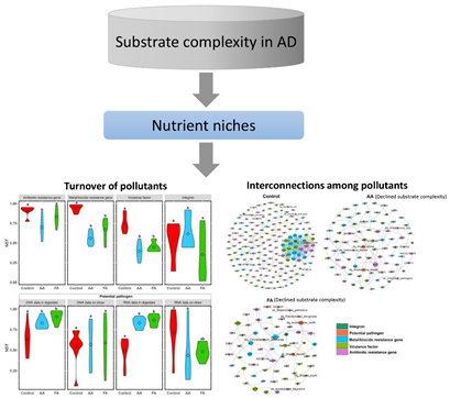 中国科学院成都生物研究所李香真研究员课题组林强博士等研究人员对厌氧发酵系统中抗生素抗性基因和人畜病原菌的活性和动态进行了深入系统的研究。研究者在猪粪厌氧发酵产沼气系统中,利用简单的有机底物(如苹果残渣和果糖),利用16S rRNA, 16S DNA扩增子测序和宏转录组测序,对发酵系统中抗生素抗性基因,抗重金属或杀菌剂基因,整合子整合酶基因,人畜病原菌和毒力因子等的活性和动态进行了研究。结果发现,发酵底物的复杂性对生素抗性基因和人畜病原菌的活性,动态和互作有巨大影响,但是多重抗药性基因,四环素抗性基因,氨基糖苷类抗生素抗性基因,利福霉素抗性基因,金属铜、砷抗性基因,整合酶基因intI1,病原性大肠杆菌,Streptococcus gallolyticus 和 Clostridium perfringens在整个发酵过程中都具有较高的活性。较低的底物复杂性有利于减少抗性基因表达的数量,减弱这些污染物之间的互作。