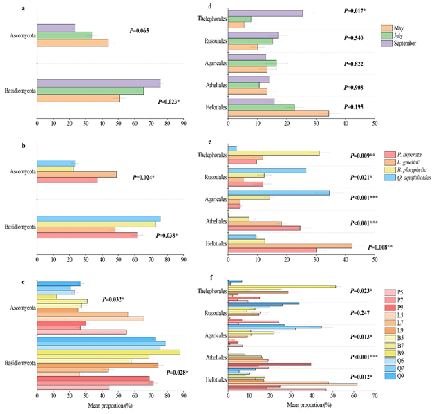 2. 土壤真菌群落优势门和目在不同季节和树种下丰度比例的差异