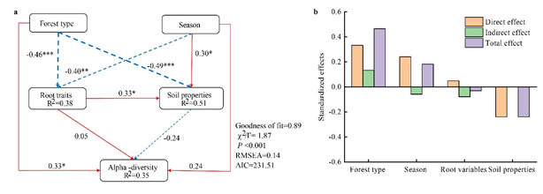 3. 结构方程模型SEM分析树种和季节对土壤真菌多样性的影响(a, 偏最小二乘路径模型得出的标准化直接和间接影响(b