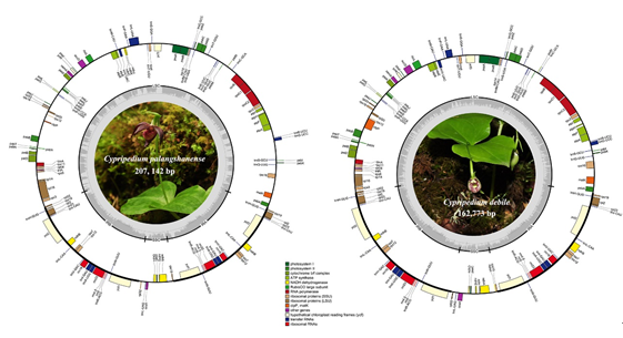 研究团队首次报道了巴郎山杓兰(Cypripedium palangshanense)和对叶杓兰(Cypripedium debile)的叶绿体基因组特征,两个基因组长度为162,773-207,142 bp,包含128-130个基因,包括82-84个蛋白编码基因,38个tRNA基因和8个rRNA基因;共定义了2,192个简单序列重复(SSRs),786个长重复序列(LSRs)和7,929个可变位点(High Variable Loci);确定了12个高度多态的基因座(Pi>0.09),适合于推断杓兰属物种的系统发育。此外,还揭示了该属叶绿体基因组显著扩增的机制,并讨论了IR区的扩增导致SSC区的基因假基因化或丢失。同时,基于叶绿体基因组数据构建的系统发育树为解决兰科植物的系统发育提供了新的见解。
