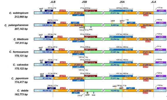 图2. 七个Cypripedium叶绿体基因组边界的扩张和收缩分析。